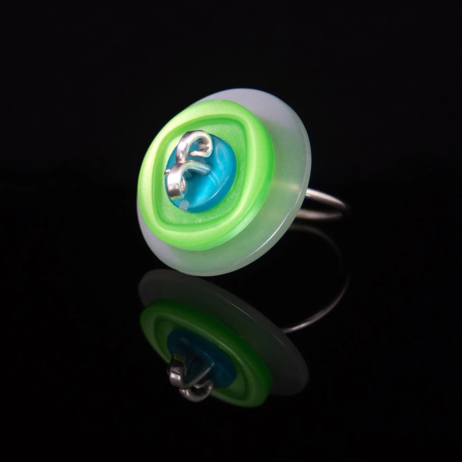 The button ring is created by stacking buttons and forging a heavy sterling wire into a ring. Finally, the ends are twisted to secure the stack.