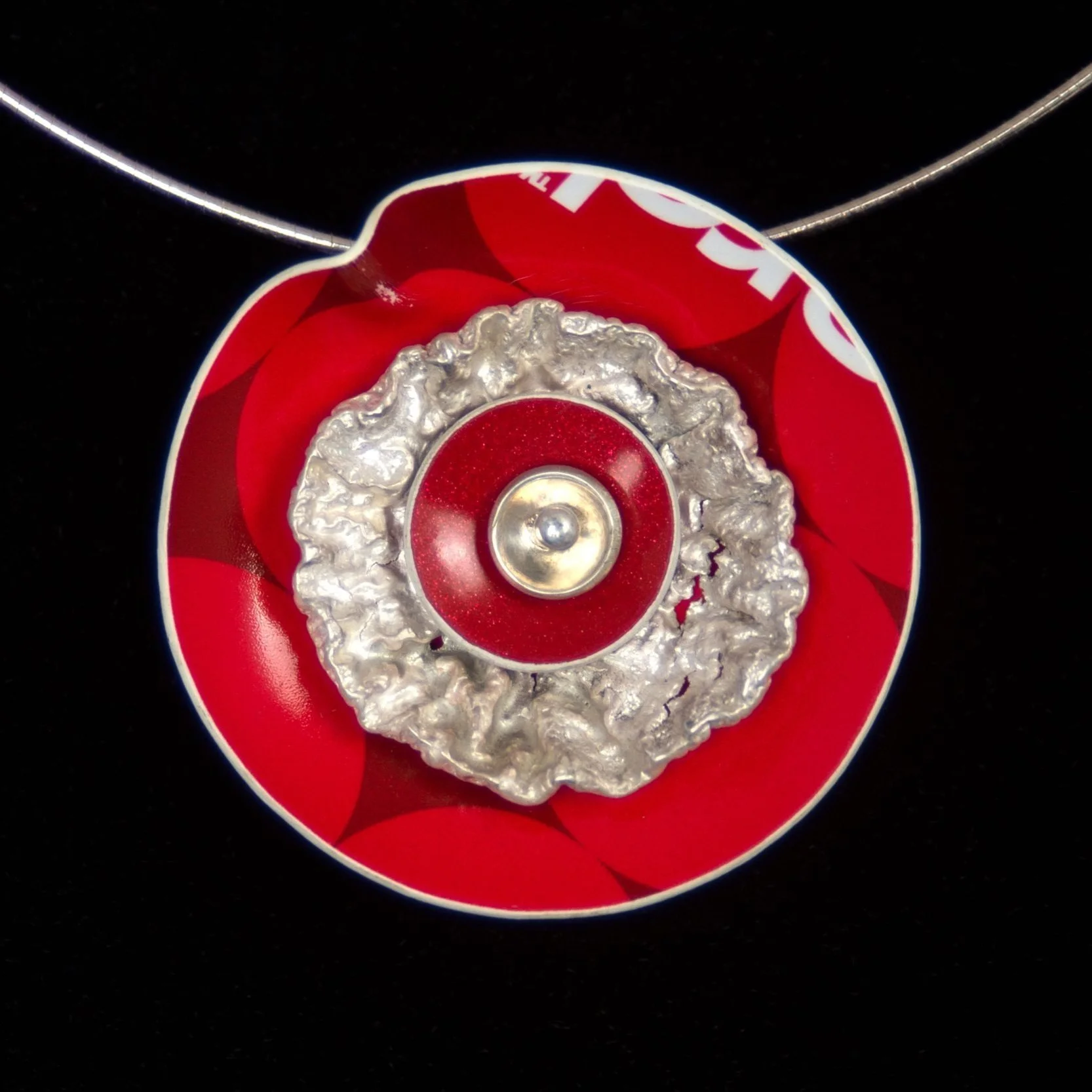 This pendant combines gift cards with a Roosevelt dime, which minted between 1946 and 1964 and contain 90% silver. I have developed a method where the coins are heated until they almost become liquid, causing them to transform into stunning and uneven discs.