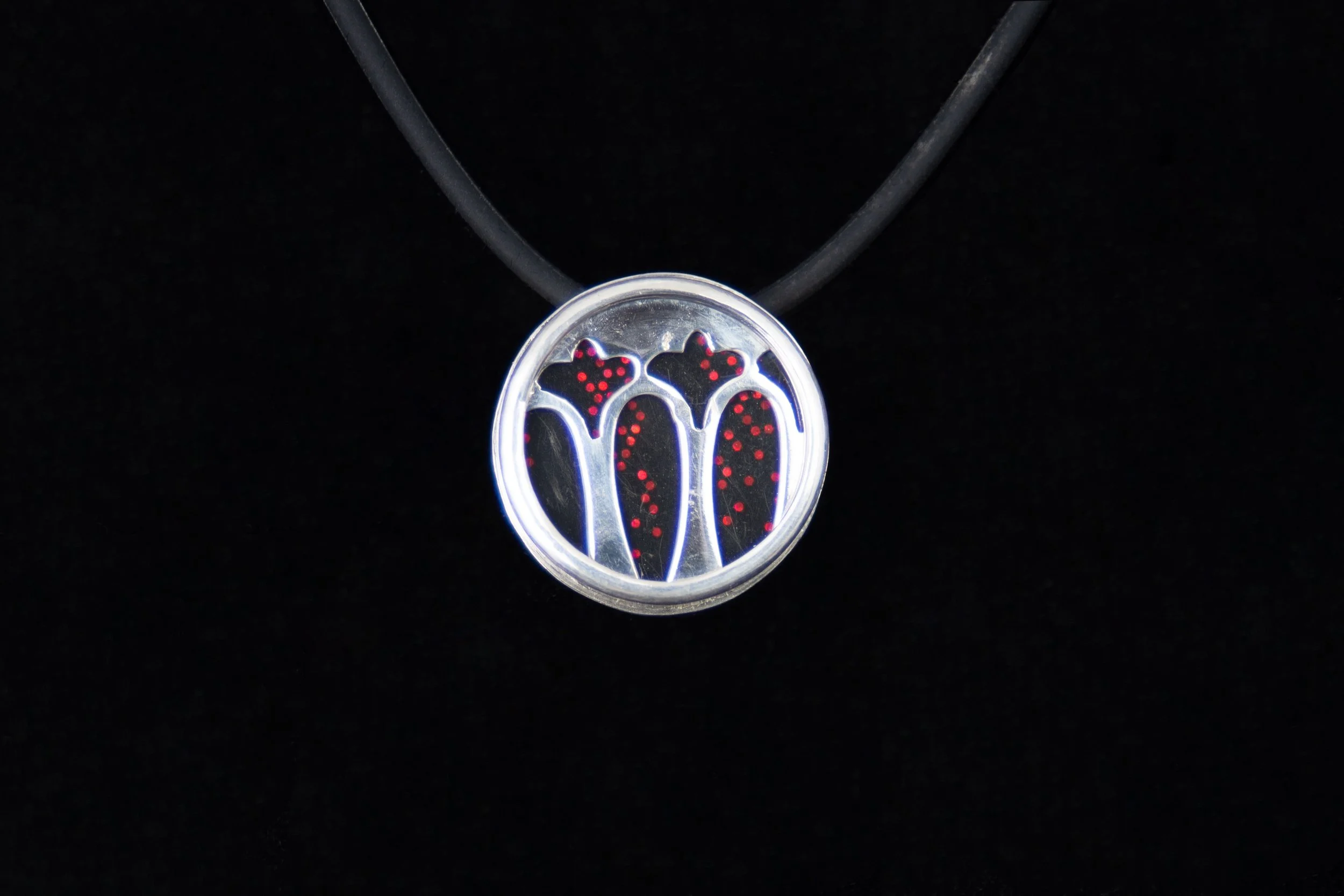 This pendant is similar to the blue earrings; it is made from the same silverplated tray but has a striking black and sparkly red gift card. It is displayed with a black rubber cord, but you can swap it with an omega chain.